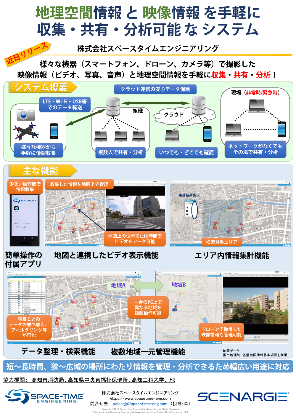 インテックス大阪にて開催された防犯防災総合展 in KANSAI 2016に出展しました。2日間に渡り、近日リリース予定の「地理空間情報と映像情報を手軽に収集・共有・分析可能なシステム」を、多くの来場者に紹介させて頂きました。スマートフォン、ドローン、カメラなどで撮影した位置情報付きの映像情報(動画、写真、音声)を LTE・Wi-Fi・USB などでデータ転送し、複数人で共有したり、クラウドと連携することでいつでもどこでもデータの確認が可能です。災害時には災害現場での状況・情報管理に、平時には公園などの公共施設や建築現場管理など、災害時・平時を問わず非常に有用なシステムです。ご興味のある方は、ぜひお問い合せください。