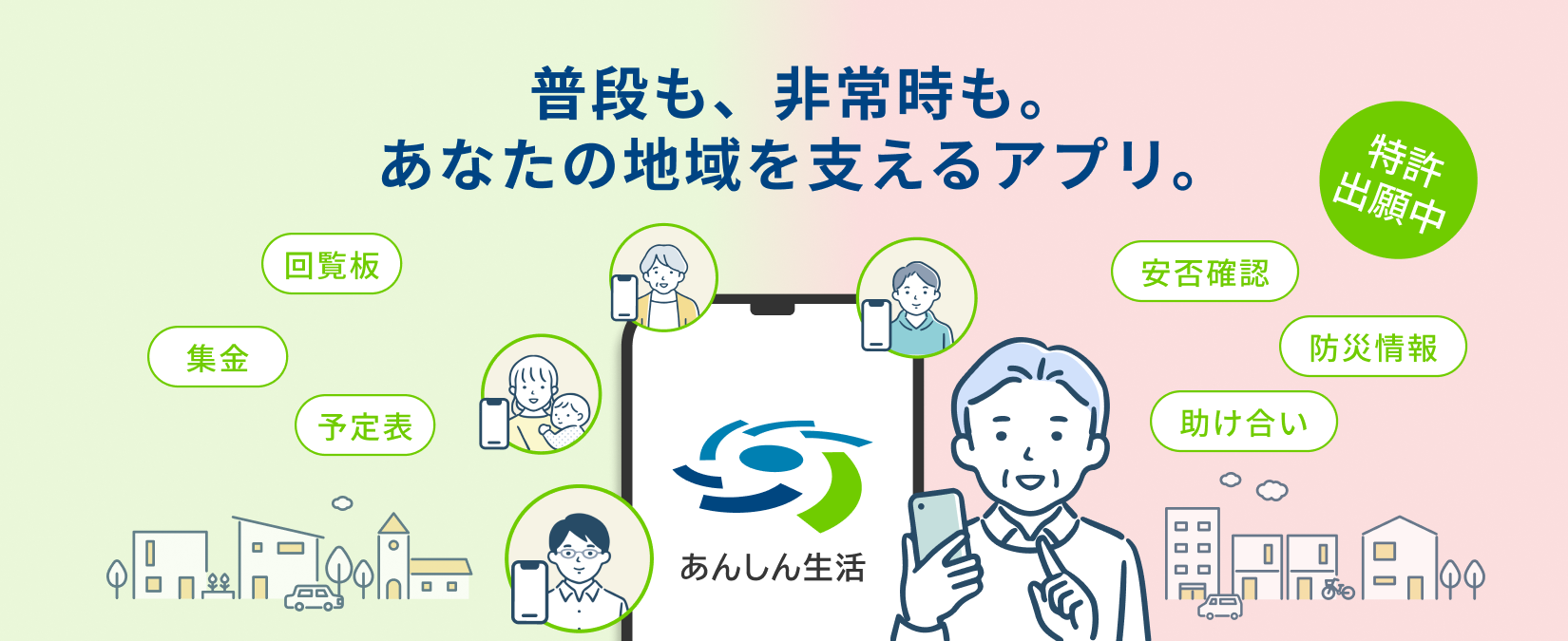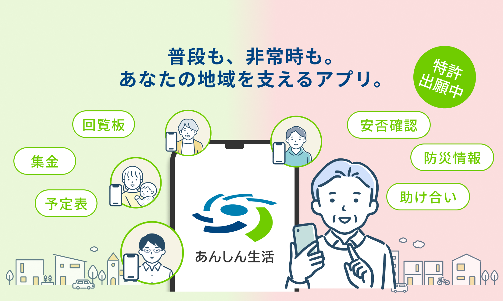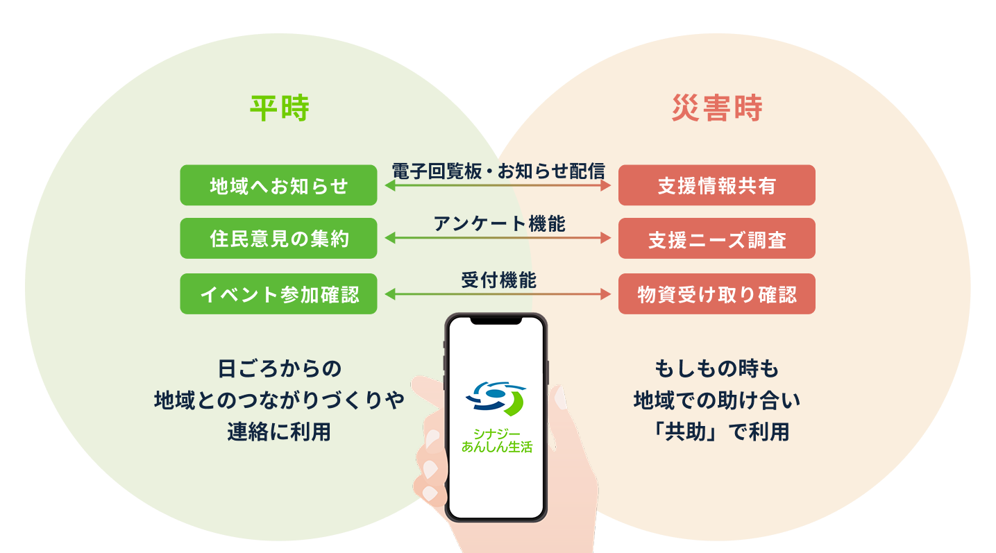 自治会業務の効率化とともに、災害時の共助活動にも活用できるフェーズフリーの「シナジーあんしん生活」。