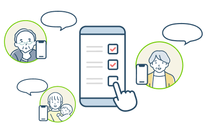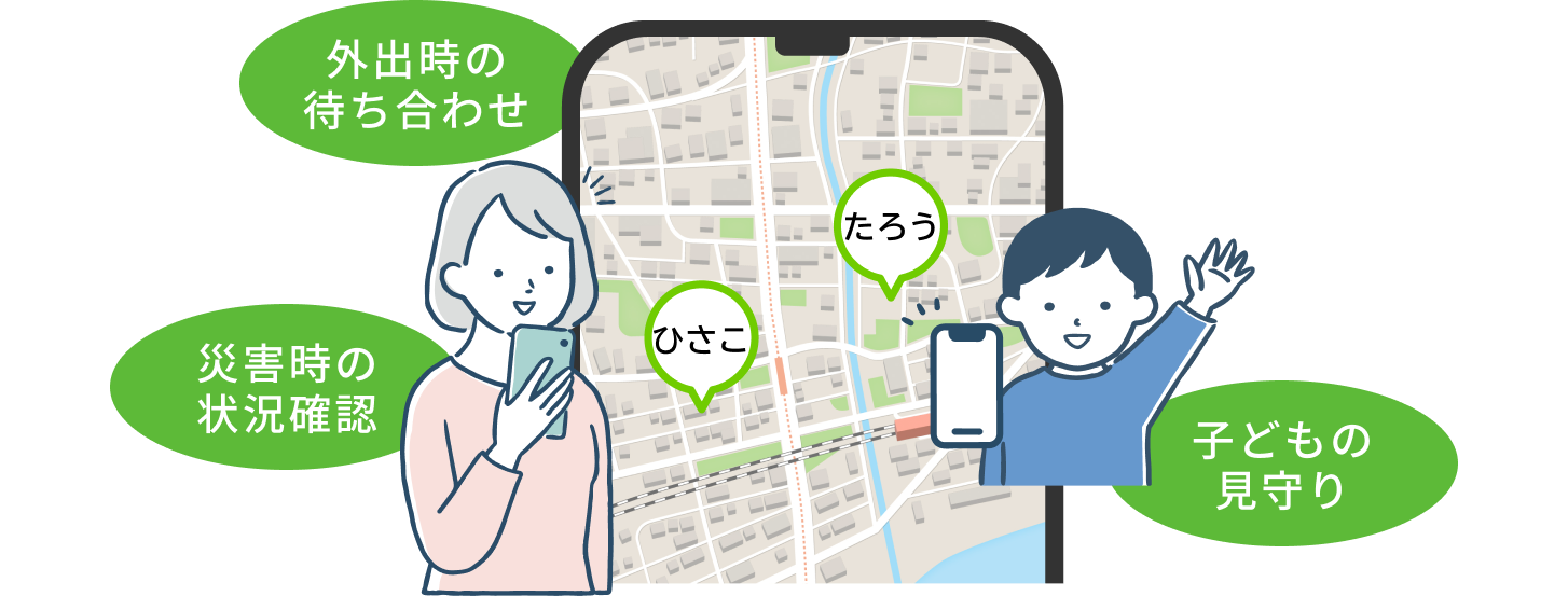 シナジーあんしん生活では、家族間チャットや安否確認時に位置情報の共有ができます。位置情報は地図上でまとめて表示し、家族それぞれの現在地を一画面で把握できるため、外出時の待ち合わせや子どもの見守り、災害時の状況確認にも役立ちます。