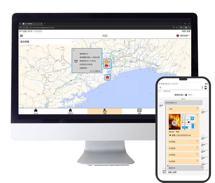消防本部や消防団の様々な消防業務を支援する新しい情報共有システムです。