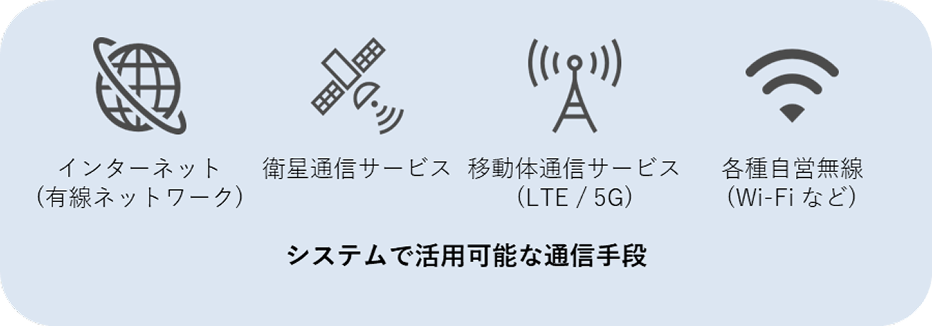 クラウドサーバや拠点設置サーバのほか、ノート型 PC や組込機器など多くの計算機器にソフトウェアをインストールすることで、より強靭なシステムが構築可能です。また、有線インターネット接続だけでなく、衛星通信、移動体通信 (LTE / 5G)、各種自営無線など、システムを多種多様な通信手段に接続すれば、通信相手や状況に応じて自動的に通信手段を選択・併用して、常にセキュアで最善の情報共有環境を提供※5します。