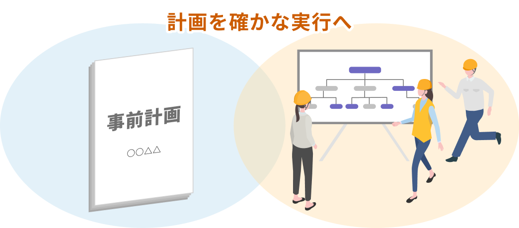事前計画と実際の参集状況を確認しながら、 役割や指揮系統を明確にし、 迅速に行動できる体制を構築します。