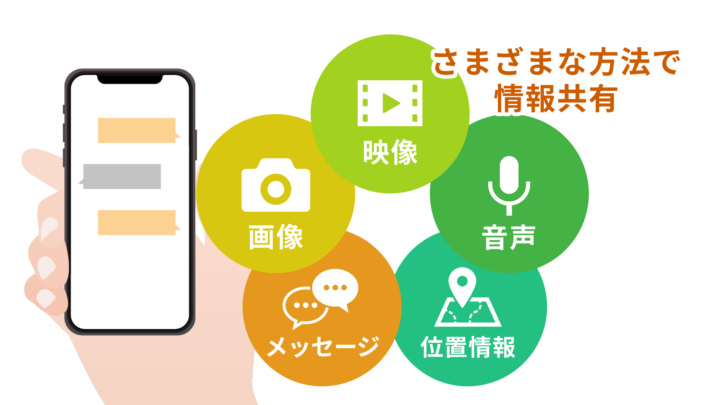 テキストメッセージに加えて、画像、映像、位置情報の共有ができます。また、トランシーバー機能も備えており、非常時の連絡手段を幅広くカバー。状況に応じて迅速かつ確実な情報共有を支えます。