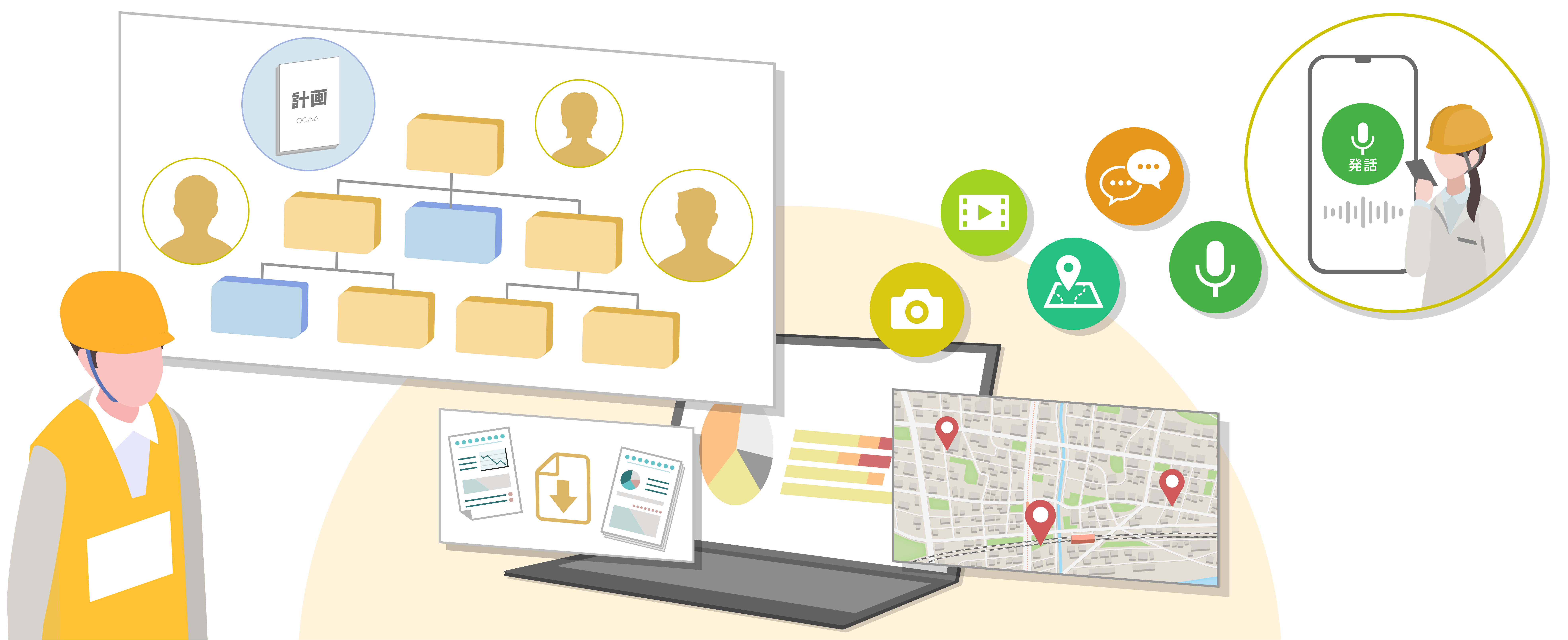 位置情報付きメッセージや音声通話など多様な連絡手段と、 組織に応じたグループ機能により、 具体的かつ効率的に情報を共有。