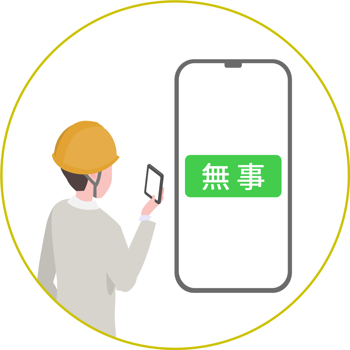 対策本部から安否確認連絡を配信し、各自アプリで回答。